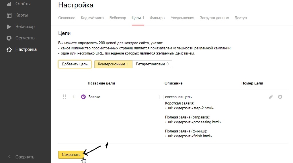 Выбираем пункт "Настройки", потом "Цели" и нажимаем кнопку "Добавить цель".